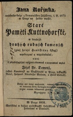 Jana Kořjnka, welebného kněze z Towaryšstwa Ježjssowa, l. P.1675 w Praze na swětlo wysslé Staré paměti kuttnohorské