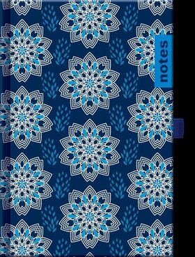 Nedatovaný notes má modrou ražbu, poutko na pero, obsahuje 208 stran, vnitřní listy krémové barvy s řádky. Formát: 205x138x11 mm