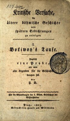 Kritische Versuche, die ältere böhmische Geschichte von spätern Erdichtungen zu reinigen., i., bořiwoy's taufe : zugleich eine probe, wie man alte legenden für die geschichte benutzen soll